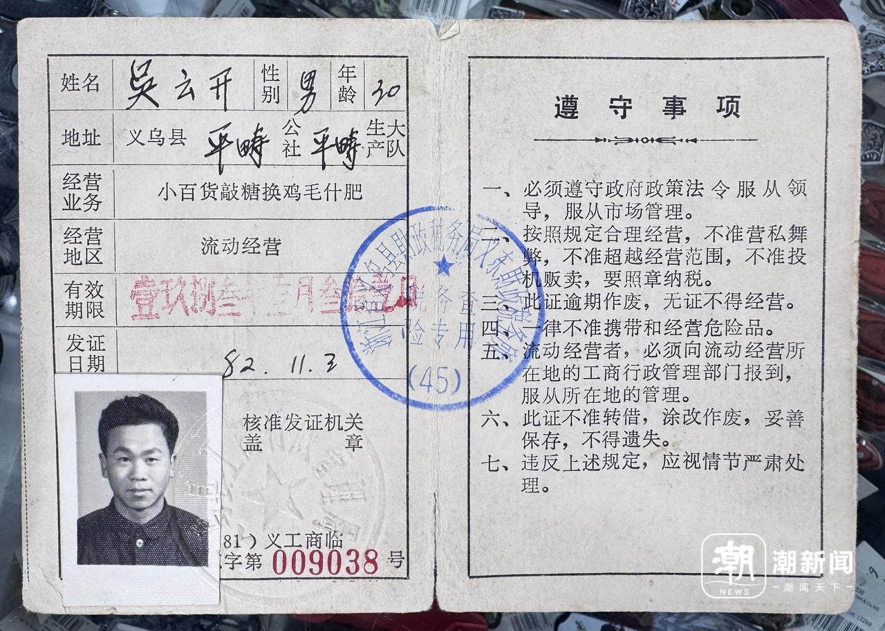 话语间,吴云开从腰间掏出一个信封,里面拆着一个特殊的证件,一份1982年11月3日义乌县工商行政办理局颁布的“小百货敲糖换取鸡毛什肥”姑且许可证。吴云开保留得很好,其时的他方才30岁,证件上的口角照片还显得有些青涩。