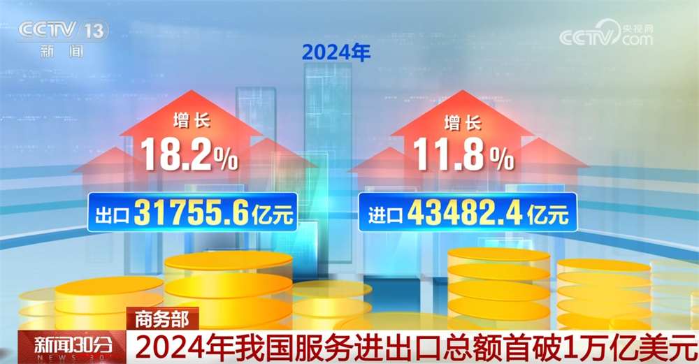 商务部数据显示,2024年,我国办事商业实现快速增加,全年办事进出口总额初次冲破1万亿美元,规模创下汗青新高,布局持续优化,展示出广漠的成长潜力。2024年,中国全年办事进出口总额75238亿元,同比增加14。4%。出口31755。6亿元,增加18。2%;进口43482。4亿元,比上年削减314。3亿元。